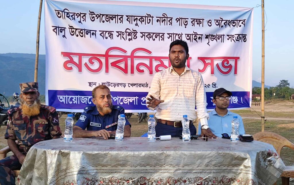সুনামগঞ্জের তাহিরপুর উপজেলার যাদুকাটা নদীর পাড় রক্ষা ও অবৈধভাবে বালু উত্তোলন বন্ধে সংশ্লিষ্ট সকলের সঙ্গে আইন-শৃঙ্খলা সংক্রান্ত মতবিনিময় সভা অনুষ্ঠিত হয়েছে।