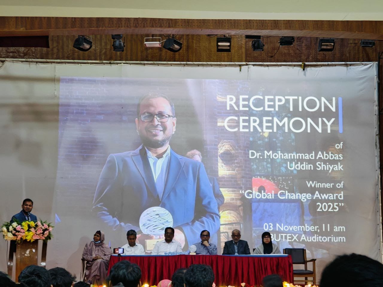 বাংলাদেশ টেক্সটাইল বিশ্ববিদ্যালয়ের (বুটেক্স) ডাইস অ্যান্ড কেমিক্যাল ইঞ্জিনিয়ারিং বিভাগের সহযোগী অধ্যাপক ড. মোহাম্মদ আব্বাস উদ্দিন শায়ক “গ্লোবাল চেঞ্জ অ্যাওয়ার্ড ২০২৫” অর্জন করায় এক সংবর্ধনা অনুষ্ঠান অনুষ্ঠিত হয়েছে।