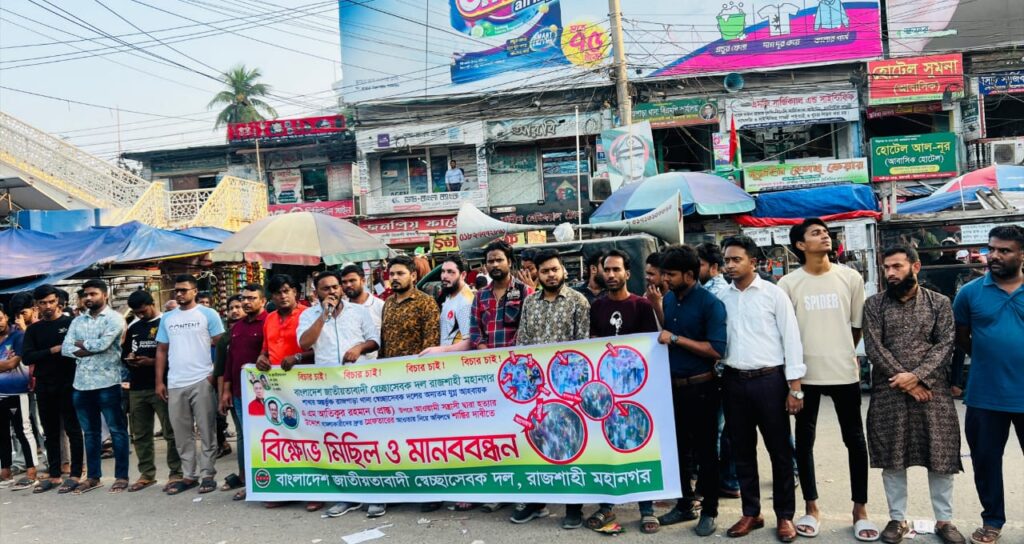 রাজশাহীতে স্বেচ্ছাসেবক দলের বিক্ষোভ–মানববন্ধন, হামলাকারীদের দ্রুত গ্রেফতারের দাবি