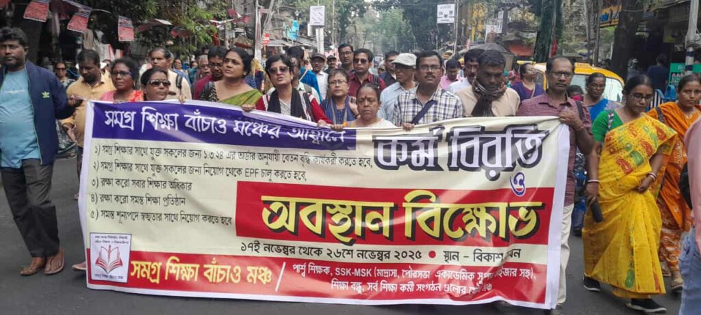 কলকাতার ধর্মতলা এলাকায় শুক্রবার দুপুরে সমগ্র শিক্ষা বাঁচাও মঞ্চের উদ্যোগে অনুষ্ঠিত হয় বৃহৎ কর্মবিরতি, অবস্থান বিক্ষোভ ও ডেপুটেশন কর্মসূচি। ২১ নভেম্বর ঠিক দুপুর একটায় শিয়ালদা স্টেশন সংলগ্ন এলাকা থেকে কয়েকশো পার্শ্ব শিক্ষক, এসএসকে-এমএসকে শিক্ষক, পঞ্চায়েত ও পৌরসভাভুক্ত শিক্ষাকর্মীসহ সমগ্র শিক্ষা মিশনে যুক্ত বিভিন্ন সংগঠনের সদস্যরা মিছিল করে এসএন ব্যানার্জি রোড হয়ে ধর্মতলা ডরিনা ক্রসিংয়ে জড়ো হন।