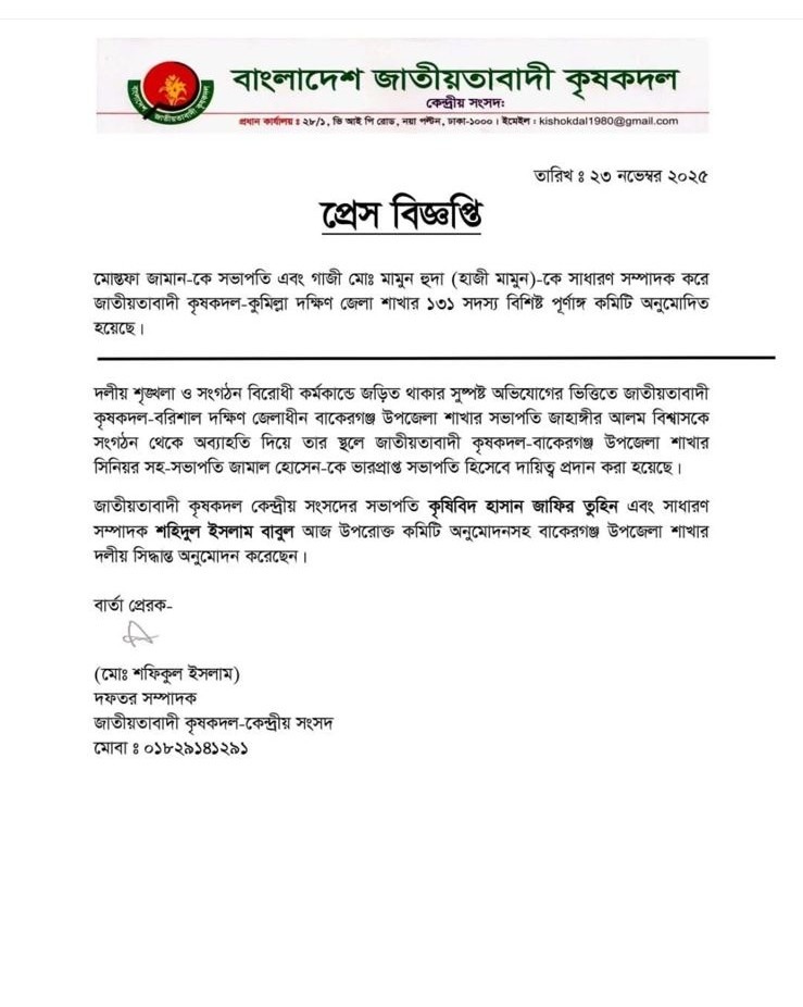 ২৩ নভেম্বর একটি প্রেস বিজ্ঞপ্তির মাধ্যমে জাতীয়তাবাদী কৃষকদলের বাকেরগঞ্জ উপজেলা শাখার সভাপতি জাহাঙ্গীর আলম বিশ্বাস কে সংগঠন থেকে অব্যাহতি দেওয়া