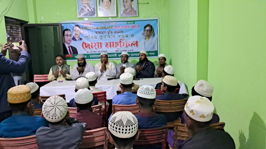 বিএনপি চেয়ারপার্সন ও সাবেক তিনবারের প্রধানমন্ত্রী দেশনেত্রী বেগম খালেদা জিয়ার দ্রুত রোগমুক্তি কামনায় বাগেরহাটে অনুষ্ঠিত হলো কুরআন খতম ও দোয়া মাহফিল। শনিবার (২৯ নভেম্বর) সন্ধ্যায় জেলা শহরের নূর মসজিদ মোড় এলাকায় বাংলাদেশ জাতীয়তাবাদী ওলামা দল বাগেরহাট জেলা শাখার উদ্যোগে আয়োজিত এই ধর্মীয় অনুষ্ঠানে স্থানীয় বিএনপি, অঙ্গসংগঠন, সাধারণ মুসল্লি ও তরুণ কর্মীদের উপস্থিতি ছিল চোখে পড়ার মতো।