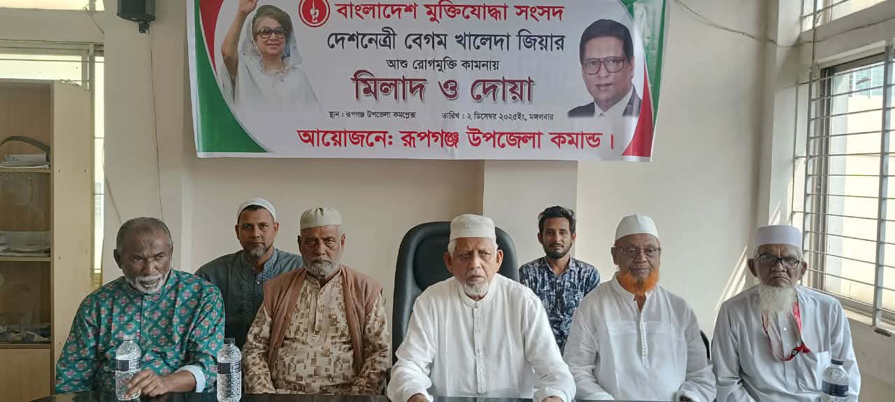 বাংলাদেশ জাতীয়তাবাদী দল (বিএনপি)-এর চেয়ারপার্সন ও সাবেক প্রধানমন্ত্রী বেগম খালেদা জিয়ার দ্রুত সুস্থতা কামনায় নারায়ণগঞ্জের রূপগঞ্জে এক বিশেষ দোয়া ও মিলাদ মাহফিল অনুষ্ঠিত হয়েছে। সোমবার সকালে উপজেলার মুড়াপাড়া ইউনিয়নের মুক্তিযোদ্ধা কমপ্লেক্সে মুক্তিযোদ্ধাদের উদ্যোগে এই ধর্মীয় আয়োজন সম্পন্ন হয়। সাম্প্রতিক সময়ে খালেদা জিয়ার শারীরিক অবস্থার অবনতি হওয়ায় তাঁর আরোগ্যের প্রার্থনায় স্থানীয় মুক্তিযোদ্ধা ও সাধারণ মানুষের অংশগ্রহণে মাহফিলটি বিশেষ গুরুত্ব পায়।