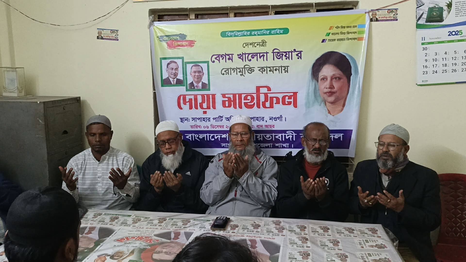 বিএনপি চেয়ারপারসন ও সাবেক প্রধানমন্ত্রী বেগম খালেদা জিয়ার দ্রুত আরোগ্য কামনায় নওগাঁর সাপাহার উপজেলায় দোয়া মাহফিল, খাদ্য বিতরণ এবং গণসংযোগ কর্মসূচি অনুষ্ঠিত হয়েছে। শুক্রবার জুমার নামাজের পর উপজেলা বিএনপি কার্যালয় ও স্থানীয় বিভিন্ন এলাকায় এই মানবিক উদ্যোগ পরিচালনা করা হয়।