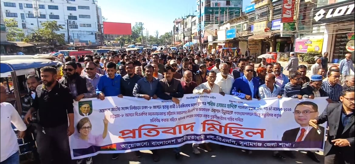 হাদির ওপর হামলার প্রতিবাদে সুনামগঞ্জে বিএনপির উদ্যোগে বিক্ষোভ মিছিল ও প্রতিবাদ সমাবেশ অনুষ্ঠিত হয়েছে। ঢাকা-৮ আসনের স্বতন্ত্র প্রার্থী ও ইনকিলাব মঞ্চের আহ্বায়ক শরীফ ওসমান বিন হাদির ওপর সংঘটিত হামলার ঘটনাকে কেন্দ্র করে স্থানীয় রাজনীতিতে তীব্র প্রতিক্রিয়া সৃষ্টি হয়েছে।