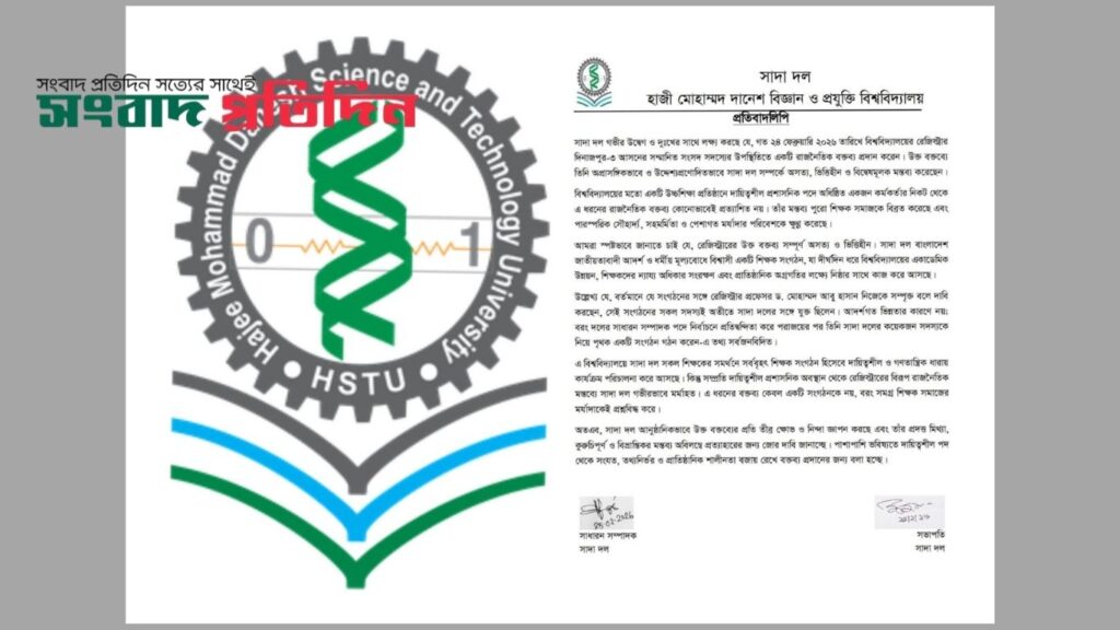 সাদা দলের সভাপতি প্রফেসর ড. মনিরুজ্জামান বাহাদুর ও সাধারণ সম্পাদক প্রফেসর ড. আলমগীর হোসেন স্বাক্ষরিত এক প্রতিবাদলিপিতে জানানো হয়, বিশ্ববিদ্যালয়ের মতো উচ্চশিক্ষা প্রতিষ্ঠানে দায়িত্বশীল প্রশাসনিক পদে থাকা একজন কর্মকর্তার কাছ থেকে এ ধরনের রাজনৈতিক বিতর্কিত বক্তব্য কোনোভাবেই প্রত্যাশিত নয়। তাঁর মন্তব্য শিক্ষক সমাজকে বিব্রত করেছে এবং পারস্পরিক সৌহার্দ্য ও পেশাগত মর্যাদার পরিবেশকে ক্ষুণ্ণ করেছে।