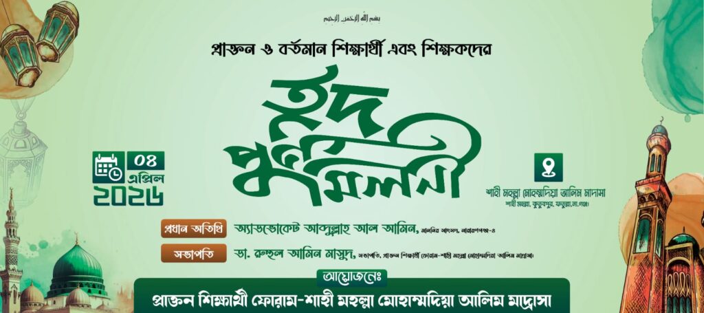 ঈদের আনন্দকে আরও অর্থবহ করে তুলতে “ঈদ পুনর্মিলনী” আয়োজনের মাধ্যমে প্রাক্তন ও বর্তমান শিক্ষার্থীদের এক মিলনমেলায় পরিণত হলো শাহী মহল্লা মোহাম্মদীয়া আলিম মাদ্রাসা প্রাঙ্গণ। গত ০৪ এপ্রিল ২০২৬ তারিখে প্রাক্তন শিক্ষার্থী ফোরামের উদ্যোগে আয়োজিত এ ঈদ পুনর্মিলনী অনুষ্ঠানটি পরিণত হয় স্মৃতিচারণ, আনন্দ ভাগাভাগি এবং ভ্রাতৃত্বের এক অনন্য আয়োজনে।