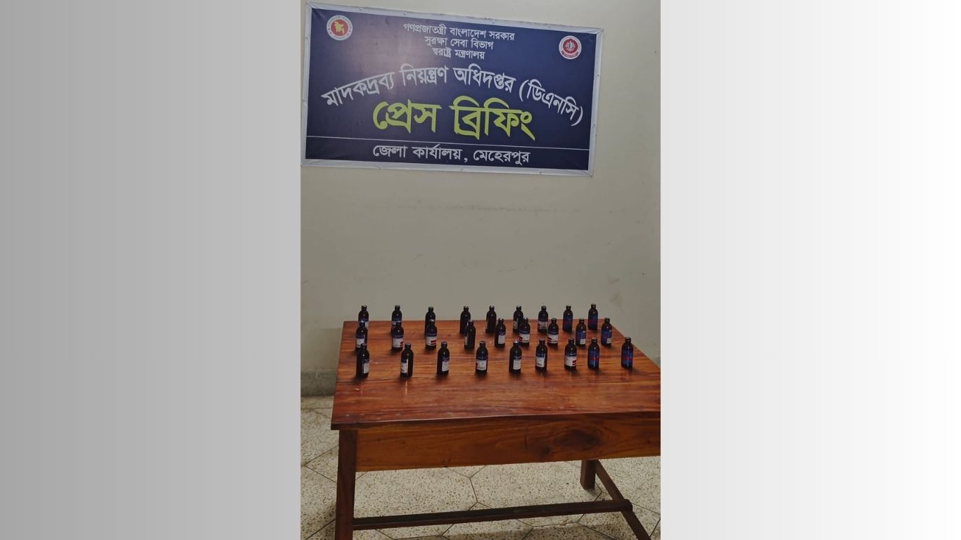 তল্লাশিকালে শয়নকক্ষের ফ্রিজের কম্প্রেসারের উভয় পাশে অত্যন্ত কৌশলে লুকানো অবস্থায় Coding Phosphate & Triprolidine Hydrochloride syrup (ESKuf) লেবেলযুক্ত ২১ বোতল এবং Coding Phosphate & Chlorpheniramine Maleate syrup লেবেলযুক্ত আরও ৬ বোতল নিষিদ্ধ মাদকদ্রব্য উদ্ধার করা হয়। প্রতি বোতল ১০০ মিলিলিটার হিসেবে মোট ২,৭০০ মিলিলিটার মাদক জব্দ করা হয়েছে। এই মেহেরপুরে মাদক উদ্ধার ঘটনায় সংশ্লিষ্ট কর্মকর্তারা জানিয়েছেন, উদ্ধারকৃত এসব সিরাপ অবৈধভাবে সংরক্ষণ ও বিক্রির উদ্দেশ্যে রাখা হয়েছিল বলে প্রাথমিকভাবে ধারণা করা হচ্ছে।