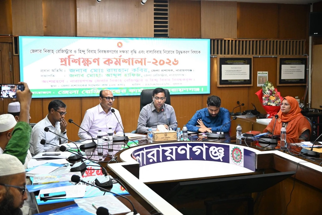 নারায়ণগঞ্জ জেলা প্রশাসনের উদ্যোগে বাল্যবিবাহ প্রতিরোধ প্রশিক্ষণ কর্মশালা অনুষ্ঠিত হয়েছে, যেখানে নিকাহ রেজিস্ট্রার ও হিন্দু বিবাহ নিবন্ধকদের পেশাগত দক্ষতা উন্নয়নের ওপর বিশেষ গুরুত্ব দেওয়া হয়। বুধবার জেলা প্রশাসকের কার্যালয়ের সম্মেলন কক্ষে আয়োজিত এ কর্মশালায় জেলার বিভিন্ন উপজেলা ও পৌরসভা থেকে আগত নিবন্ধকরা অংশগ্রহণ করেন। কর্মশালার মূল উদ্দেশ্য ছিল বাল্যবিবাহ রোধে আইনগত সচেতনতা বৃদ্ধি, নিবন্ধন প্রক্রিয়ায় স্বচ্ছতা নিশ্চিত করা এবং সামাজিক দায়বদ্ধতা জোরদার করা। অংশগ্রহণকারীরা মাঠপর্যায়ে কার্যকর ভূমিকা রাখার প্রতিশ্রুতি ব্যক্ত করেন।