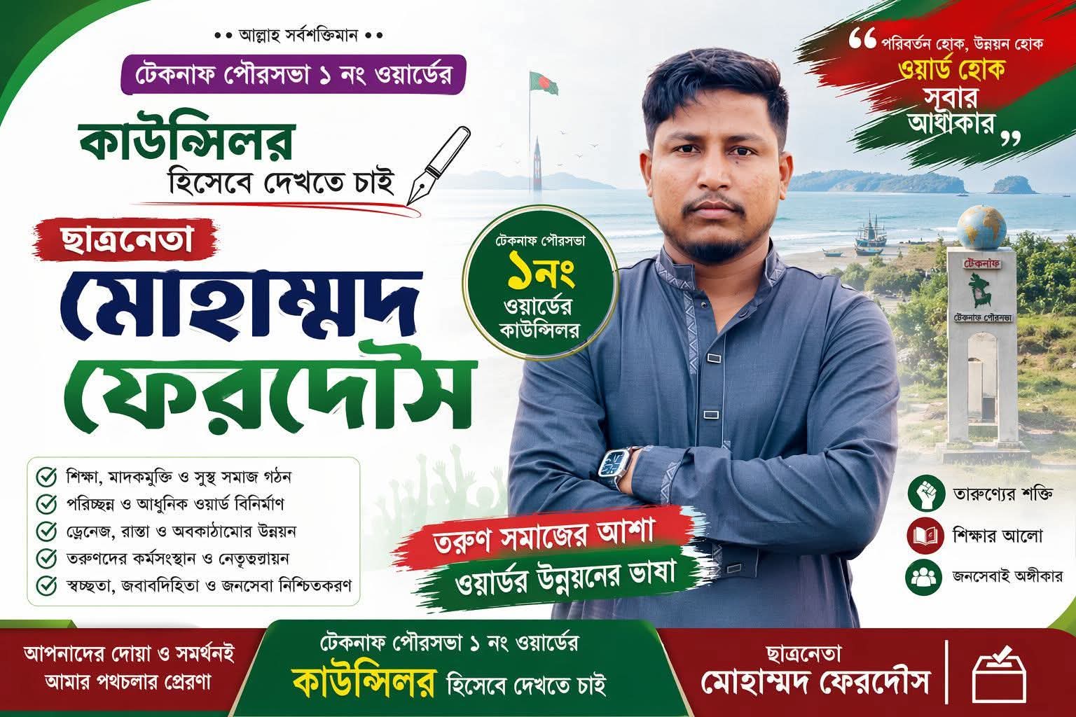 টেকনাফ পৌরসভা নির্বাচনের ১নং ওয়ার্ডে সাধারণ কাউন্সিলর পদে আলোচনার কেন্দ্রবিন্দুতে রয়েছেন তরুণ ছাত্রনেতা মোহাম্মদ ফেরদৌস। স্থানীয় রাজনীতিতে ইতোমধ্যে তিনি একজন সম্ভাবনাময় মুখ হিসেবে পরিচিতি পেয়েছেন। উন্নয়ন ও পরিবর্তনের অঙ্গীকার নিয়ে প্রচারণা চালিয়ে যাচ্ছেন তিনি। রাজনৈতিক অঙ্গনে তারুণ্যের নতুন নেতৃত্ব হিসেবে তাকে ঘিরে ব্যাপক আগ্রহ তৈরি হয়েছে। ভোটারদের মধ্যে তিনি স্বচ্ছ ভাবমূর্তি ও মানবিক কর্মকাণ্ডের জন্য প্রশংসিত হচ্ছেন। আসন্ন নির্বাচনে তাকে ঘিরে বিভিন্ন মহলে আলোচনা ক্রমেই বাড়ছে। বিশেষ করে তরুণ ভোটারদের মাঝে ফেরদৌস কাউন্সিলর হিসেবে তার অবস্থান আরও শক্তিশালী হচ্ছে, যা নির্বাচনী সমীকরণে নতুন মাত্রা যোগ করেছে।