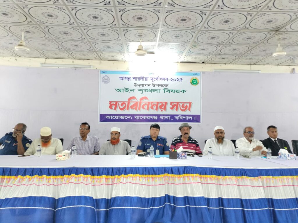 বাকেরগঞ্জে শারদীয় দূর্গোৎসব উদযাপন উপলক্ষে আইনশৃঙ্খলা বিষয়ক মতবিনিময় সভা অনুষ্ঠিত