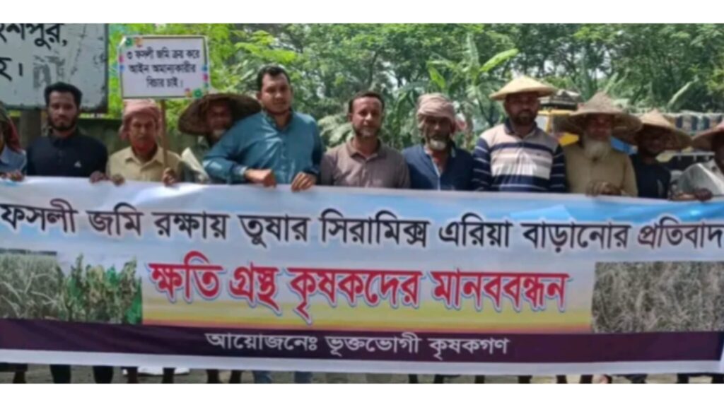 ঝিনাইদহের মহেশপুর উপজেলার ফতেপুর ইউনিয়নের সাড়াতলা এলাকায় স্থানীয় কৃষকদের আয়োজনে বৃহস্পতিবার (৩০ এপ্রিল) দুপুরে এক মানববন্ধন অনুষ্ঠিত হয়েছে। কৃষিজমি রক্ষা ও পরিবেশ দূষণ বন্ধের দাবিতে তুষার সিরামিকস কারখানার সামনে এই কর্মসূচিতে শতাধিক কৃষক অংশ নেন। মানববন্ধনে অংশ নেওয়া কৃষকদের অভিযোগ, দীর্ঘদিন ধরে কারখানা থেকে নির্গত বর্জ্য ও বিষাক্ত ধোঁয়ার কারণে আশপাশের আবাদি জমি, ফসল ও স্থানীয় পরিবেশ মারাত্মক ক্ষতির মুখে পড়েছে। বিষয়টি নিয়ে প্রশাসনের জরুরি হস্তক্ষেপ দাবি করেন তারা।