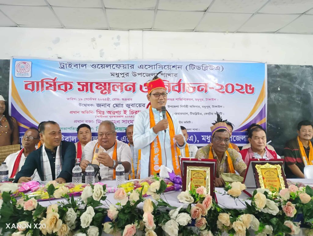 টাঙ্গাইলের মধুপুর উপজেলায় ট্রাইবাল ওয়েলফেয়ার এসোসিয়েশনের (টিডব্লিউএ) মধুপুর উপজেলা শাখার বার্ষিক সম্মেলন ও নির্বাচন–২০২৫ উৎসবমুখর পরিবেশে সম্পন্ন হয়েছে। শুক্রবার (১৯ সেপ্টেম্বর) দুপুরে উপজেলার অরণখোলা ইউনিয়নের জলছত্র শান্তি নিকেতনে আয়োজিত এ অনুষ্ঠানে উপজেলার বিভিন্ন অঞ্চল থেকে আগত নেতা-কর্মী ও প্রতিনিধি অংশগ্রহণ করেন।