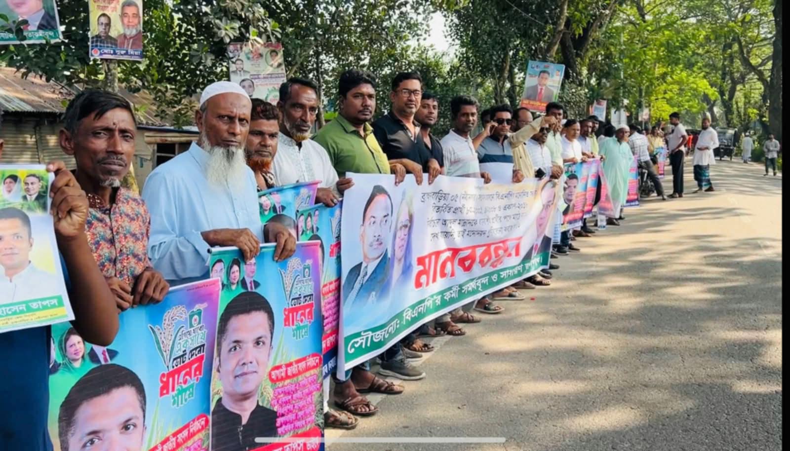 কর্মসূচি আয়োজন করেন ত্রয়োদশ জাতীয় সংসদ নির্বাচনে বিএনপির মনোনয়ন প্রত্যাশী এবং জেলা বিএনপির অর্থনৈতিক বিষয়ক সম্পাদক কাজী নাজমুল হোসেন তাপসের সমর্থকরা। এতে উপজেলার ২১টি ইউনিয়ন ও একটি পৌরসভার বিপুলসংখ্যক স্থানীয় নেতাকর্মী, সাধারণ মানুষ এবং উল্লেখযোগ্যসংখ্যক নারী অংশ নেন। অনেকেই হাতে ব্যানার ও ফেস্টুন নিয়ে মানববন্ধনে উপস্থিত হয়ে প্রার্থী পরিবর্তনের দাবি জানান।